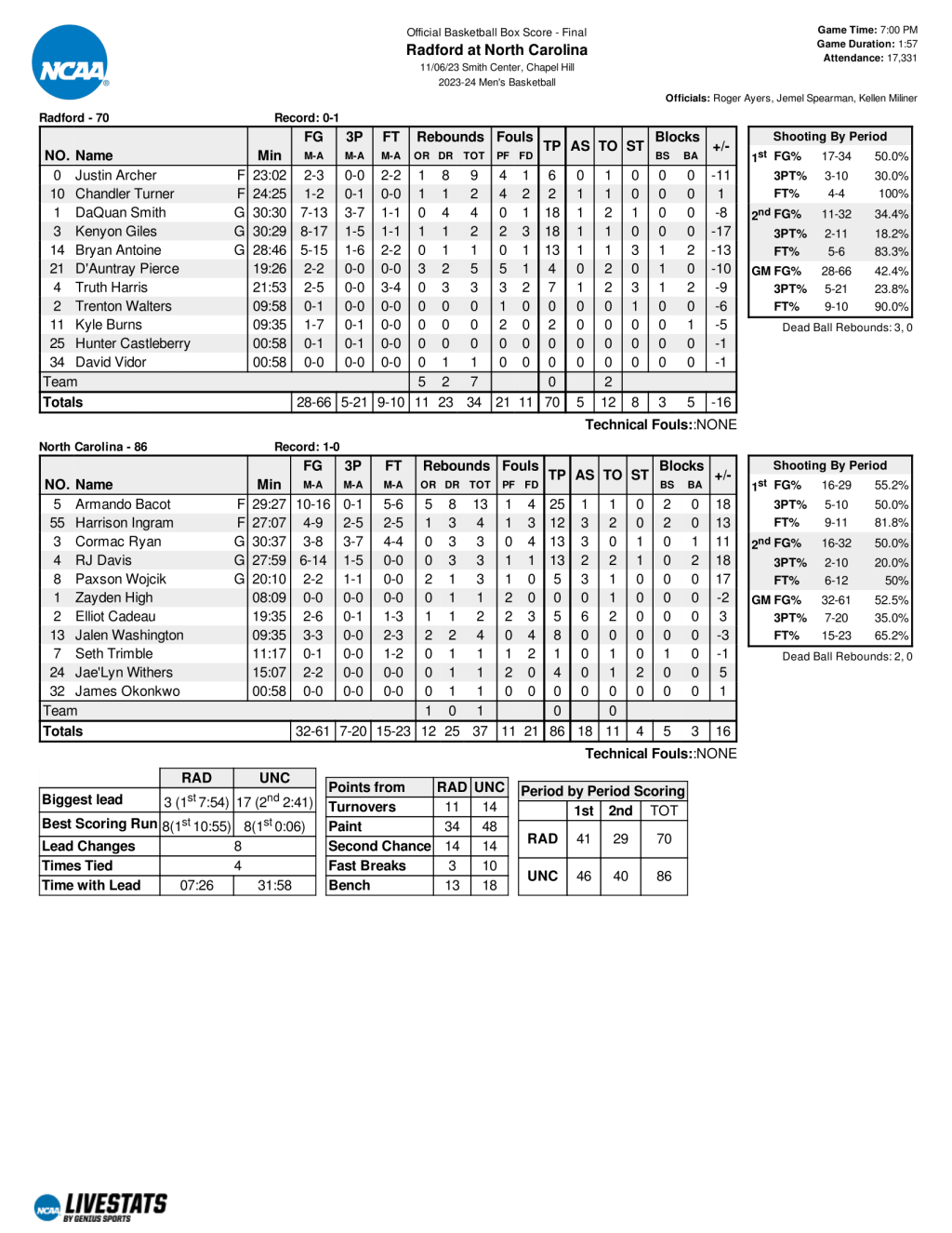 D’Auntray Pierce’s layup for Radford tied it at 20 with 10:55 left in the first half as the Highlanders outscored UNC 12–8 while RJ Davis was on the bench for 6½ minutes. Radford took a 29–26 lead with a 7–0 run.