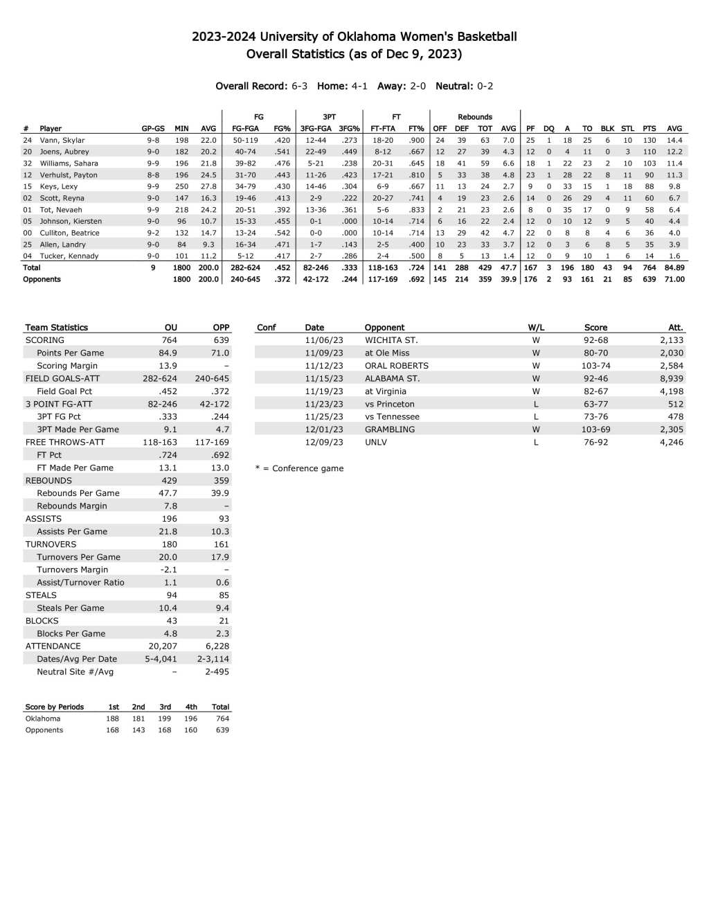 The only Sooner on the 11-player Preseason All-Big 12 team is 6–0 senior forward Skylar Vann, who leads the team in scoring (14.4 points per game) and rebounding (7.0). Two other Sooners are averaging double-figure points: 5–9 senior guard Aubrey Joens (12.2) and 6–1 junior guard Payton Verhulst (11.3).