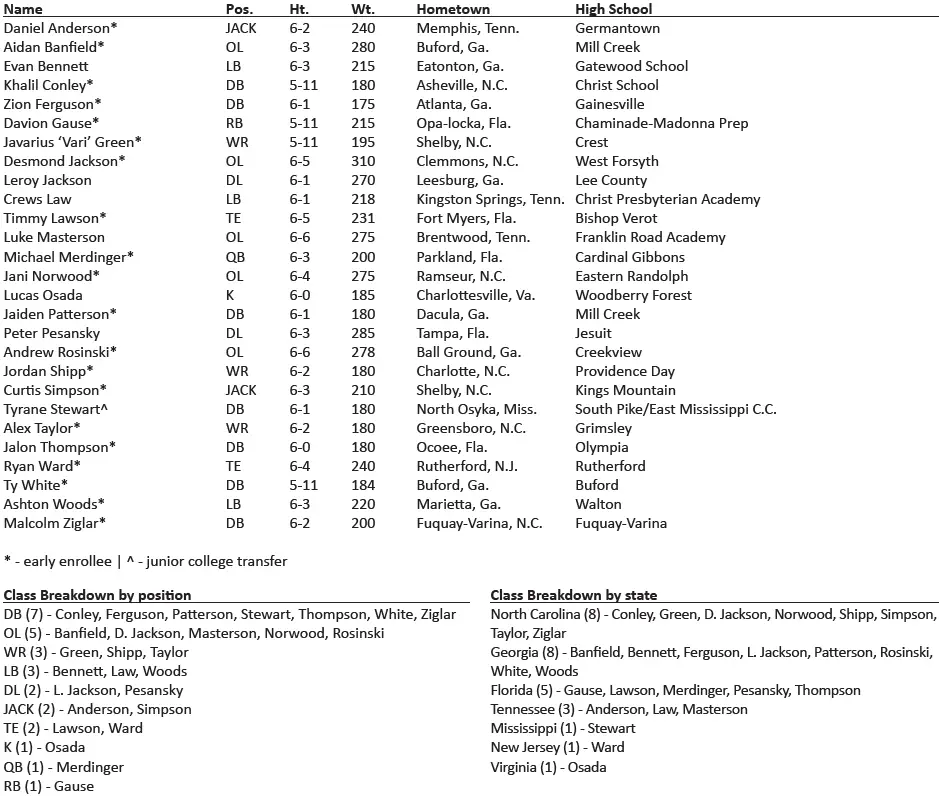 Coach Mack Brown’s class includes 14 players on defense, 12 on offense and one specialist: eight from Georgia and North Carolina, five from Florida, three from Tennessee and one each from Mississippi, New Jersey and Virginia.