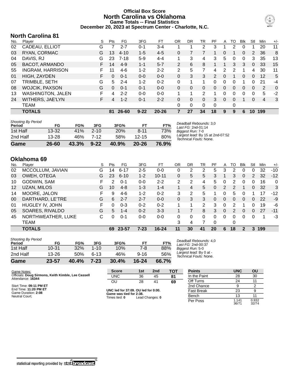 No. 11 UNC 81, No. 7 Oklahoma 69
