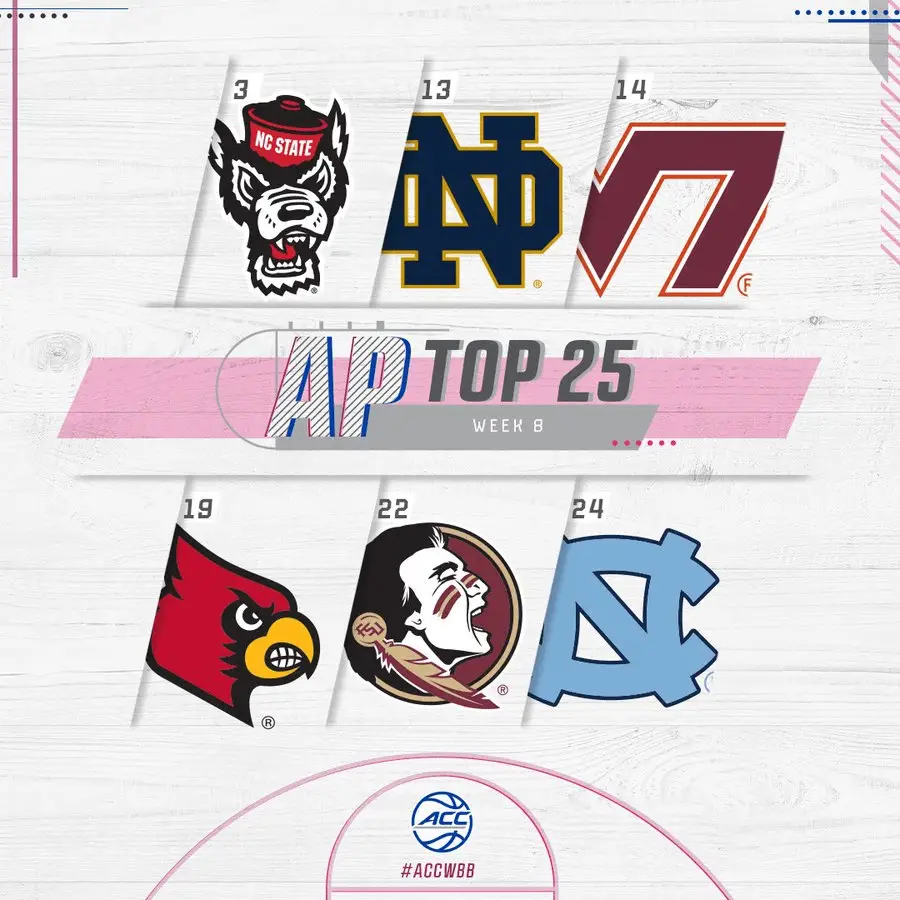 Other ACC teams in the poll are No. 3 N.C. State (12–0), which beat Old Dominion 78–50; No. 13 Notre Dame (9–1; up one spot), which beat Western Michigan 84–47; No. 14 Virginia Tech (9–2; up one spot), which beat William & Mary 67–43; and No. 22 Florida State (9–3; down one spot), which knocked off Alabama State 110–45.