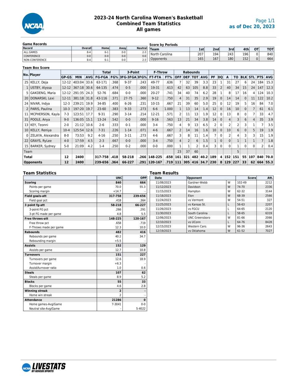 The Oklahoma win ended the regular-season non-conference schedule for UNC, which got three of its four losses against teams ranked in the latest poll: No. 1 South Carolina (11–0), No. 11 Kansas State (12–1) and No. 15 UConn (9–3), the latter two each moving up two spots.
