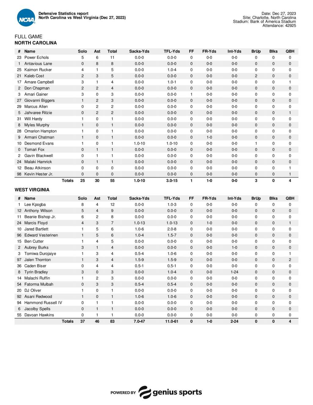 Carolina gift-wrapped excellent field position at the UNC 26 when a punt went off Christian Hamilton’s leg and WVU’s Marcis Floyd recovered it. The Tar Heels survived that thanks to big defensive plays, including a big hit from Cost, as Michael Hayes’ 52-yard field-goal attempt was short.