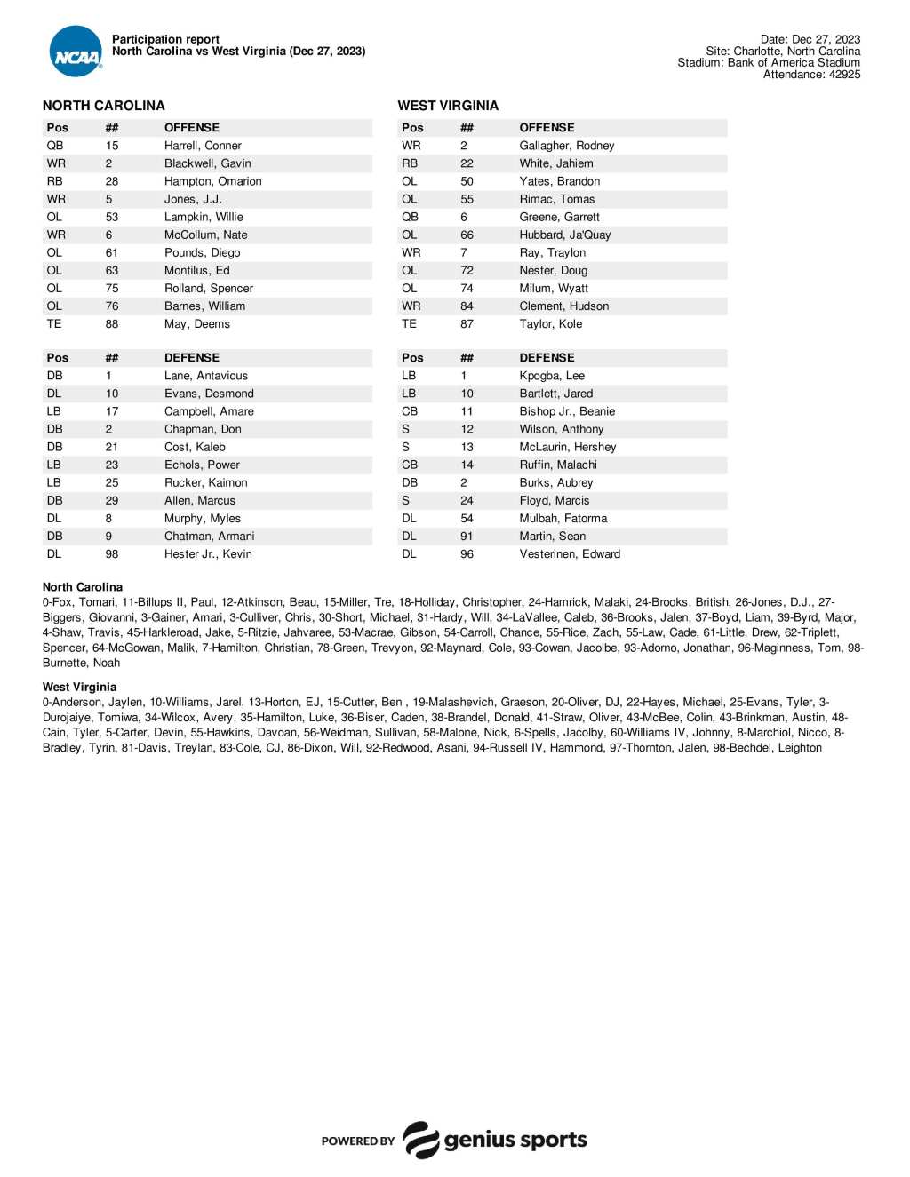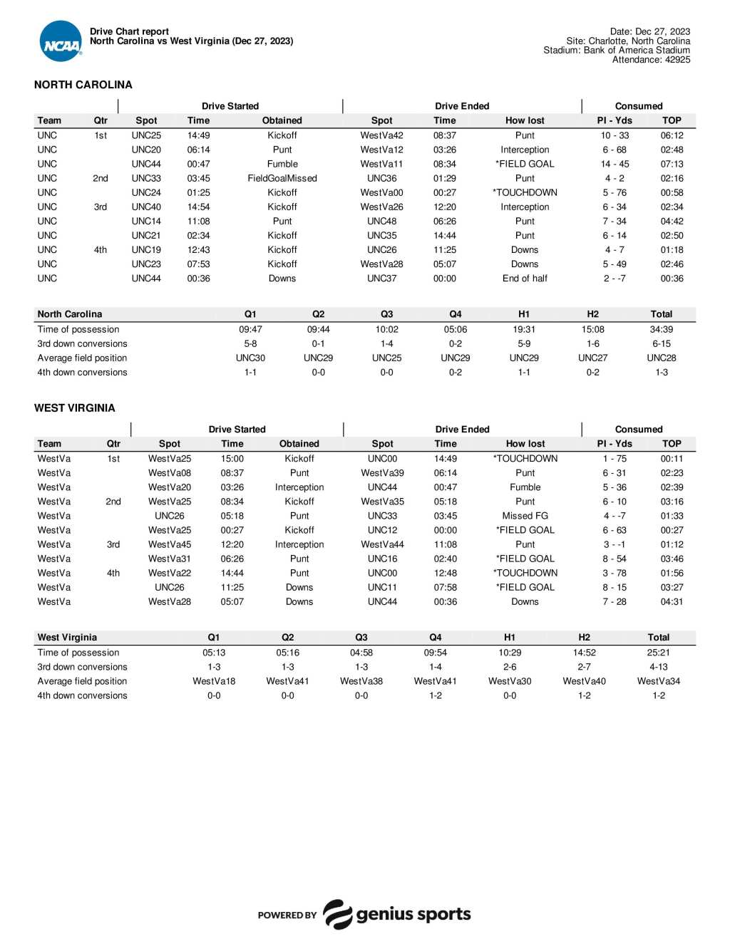 NOTES — The bowl sold no tickets in the upper part of the stadium on the UNC side, but fans were in several upper-stadium sections on the West Virginia side, with the attendance announced at 42,925. For last season’s Maryland 16–12 victory over N.C. State, the entire upper stadium was empty and the crowd was announced as 37,228. … Carolina’s Bryson Nesbit had a brace on his left leg and fellow tight end John Copenhaver got around with his right leg on a scooter. … Hampton passed Elijah Hood and finished the season with the second-most rushing yards in a single season in UNC history with 1,504 yards. Only Don McCauley had more yards in a single season, with 1,720 yards in 1970. … It was the Tar Heels’ fifth consecutive season making a bowl game, but they haven’t won since beating Temple 55-13 in the 2019 Military Bowl in Brown’s first season back in Chapel Hill. … Carolina is 1–5 in the Charlotte bowl that has various names with a 38–21 loss in 2021 to South Carolina, a 39–17 win over Cincinnati in 2013, a 19–17 loss to Pittsburgh in 2009, a 31–30 loss to West Virginia in 2008 and a 37–34 loss to Boston College in 2004. … The Mountaineers lead the series with UNC 2–1. UNC beat West Virginia 20–13 in the Gator Bowl after the 1996 season, and WVU won in Charlotte in 2008.