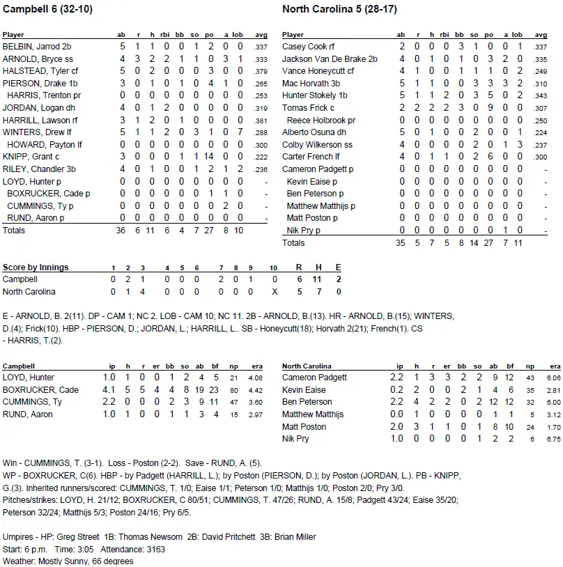 Camels right-hander Ty Cummings (winner, 3–1) struck out three in 2⅔ innings, and right-hander Aaron Rund pitched the ninth inning for his fifth save.
