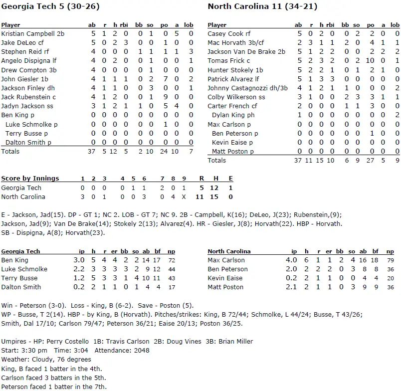 Junior right-hander Ben Peterson (winner, 3–0) relieved Carlson, who yielded six hits and one run with two walks and four strikeouts in 4+ innings. The third hit off Carlson, a Jad Jackson single to center field, scored the first Georgia Tech run. Peterson struck out his first batter, and retired the next two Jackets to avert further damage.