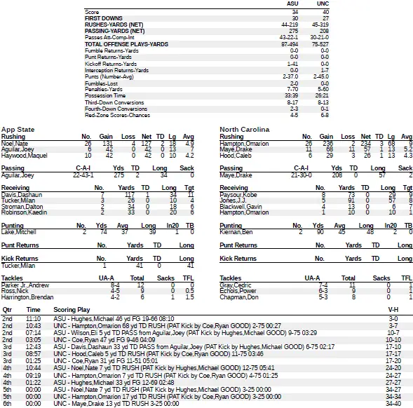 In the second OT, Maye ran 13 yards for a TD but was stopped short on his run for the pylon for a two-point conversion. UNC won the game when App State came up short on fourth down, as App State quarterback Joey Aguilar’s pass intended for Dashaun Davis was incomplete to end the game.