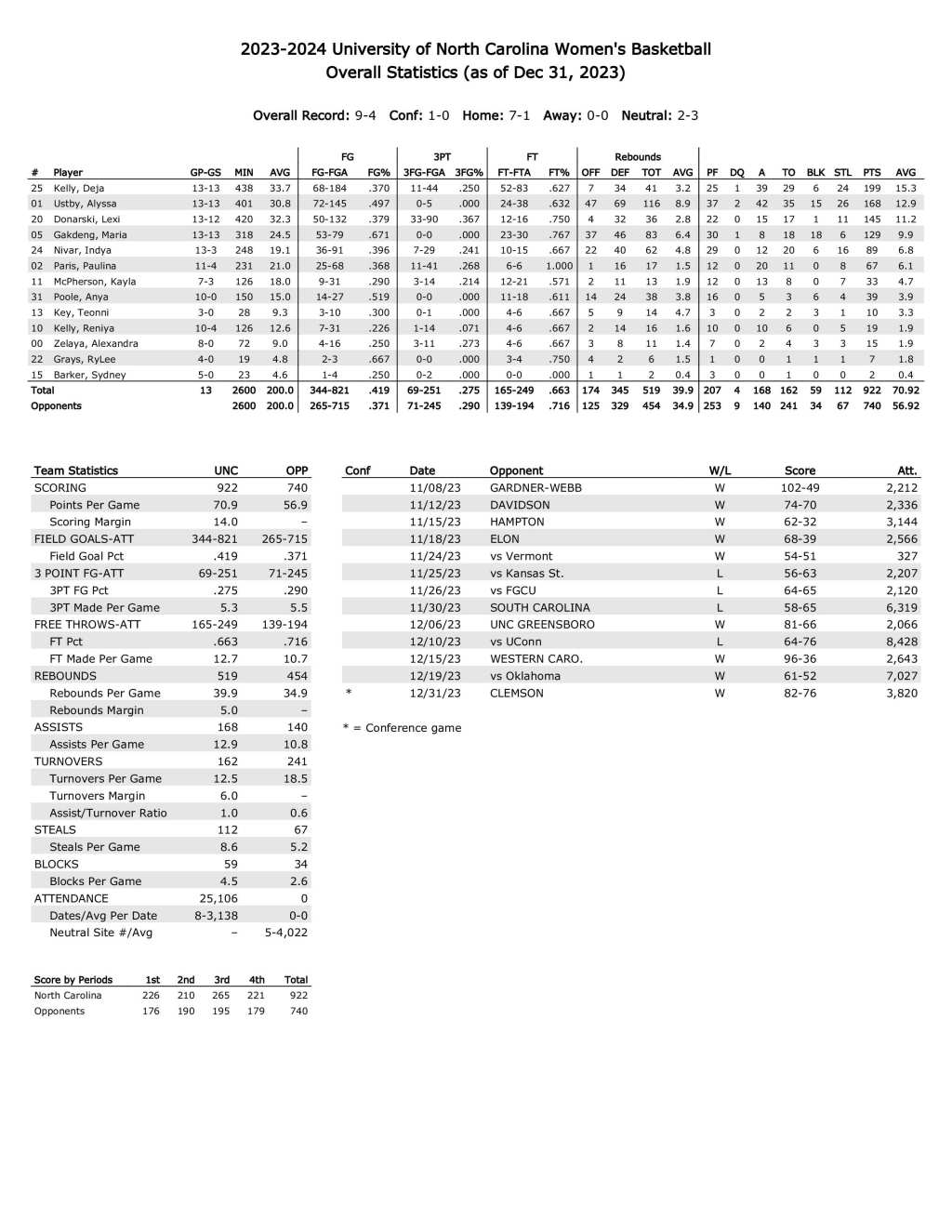 UNC season statistics