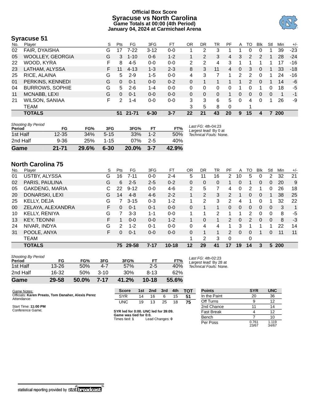 A Donarski 3-pointer in the first two minutes of the second quarter pushed the lead to 10, and UNC led by nine on an Ustby free throw with 2:30 left. But Syracuse scored the last seven points of the first half as Fair’s 3-pointer with 22 seconds left slicing UNC’s halftime lead to 32–30, with Ustby already having nine assists and six rebounds.