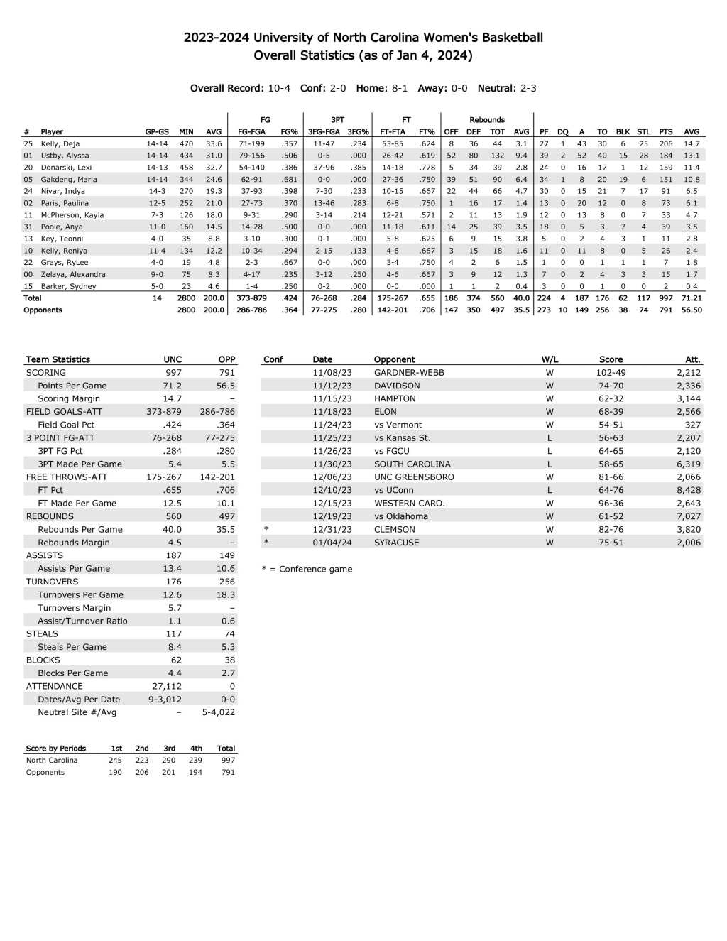 UNC season statistics