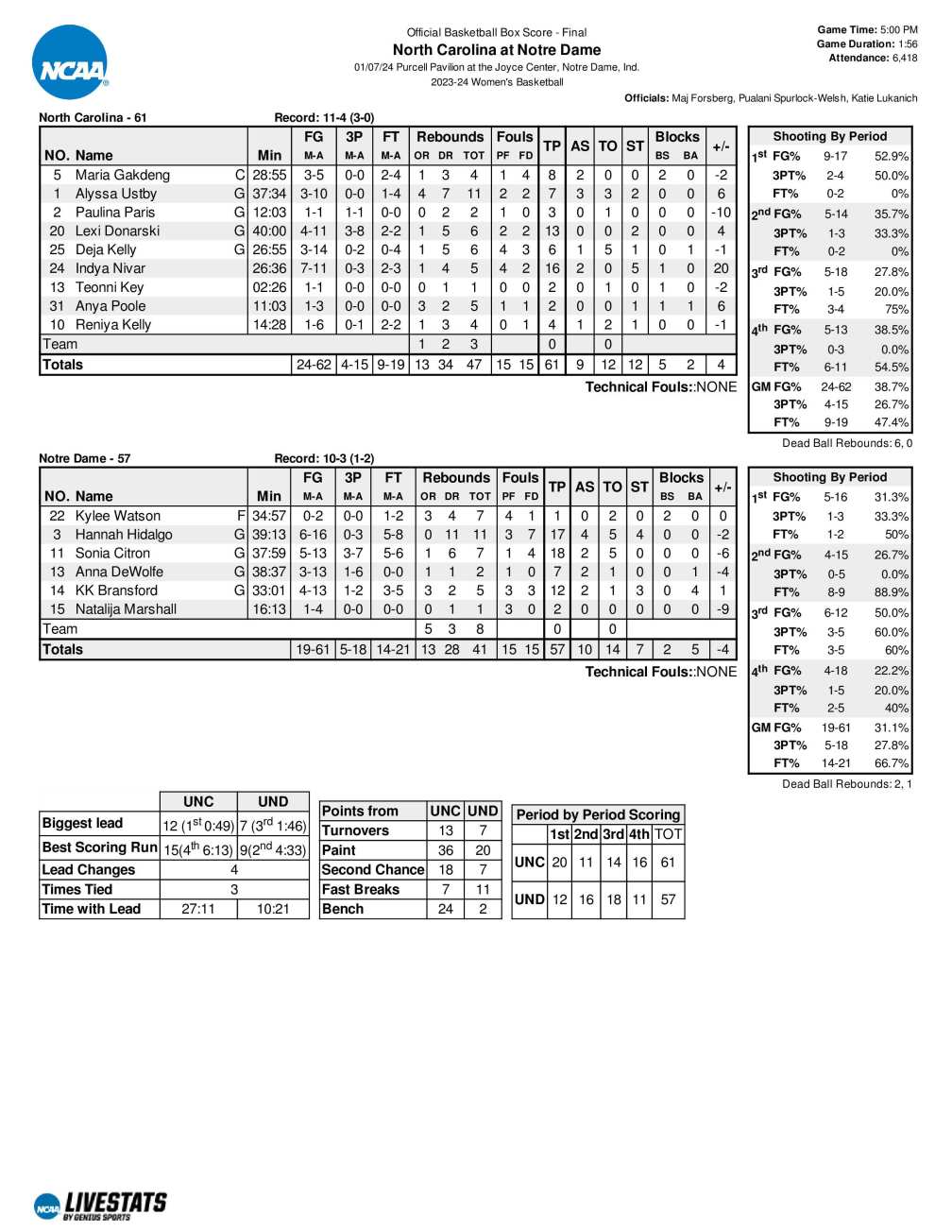 UNC 61, No. 16 Notre Dame 57