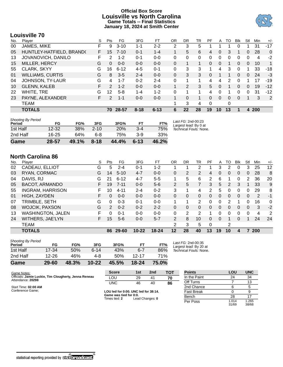 No. 4 UNC 86, Louisville 70