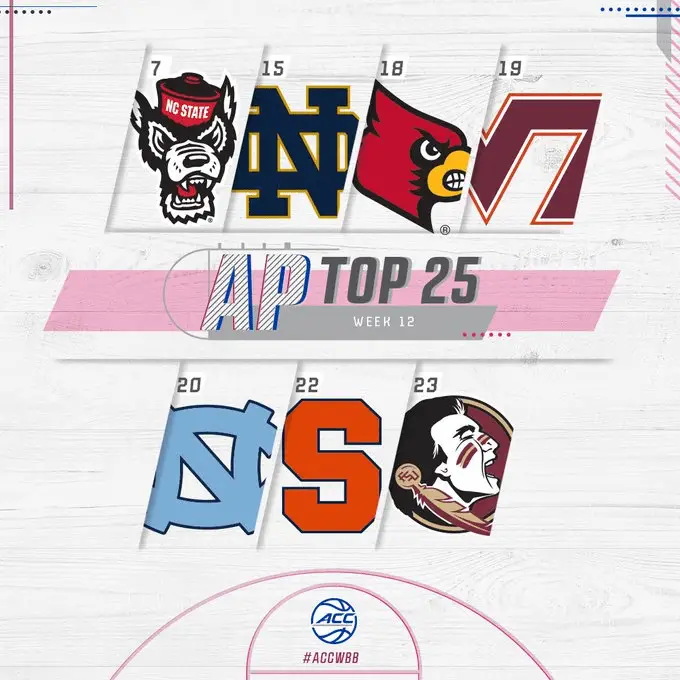 The only other ACC team ranked in last week’s poll to win both games last week was Notre Dame (14–3, 5–2), which moved up four spots to No. 15 after beating Virginia 86–76 and Wake Forest 75–56.