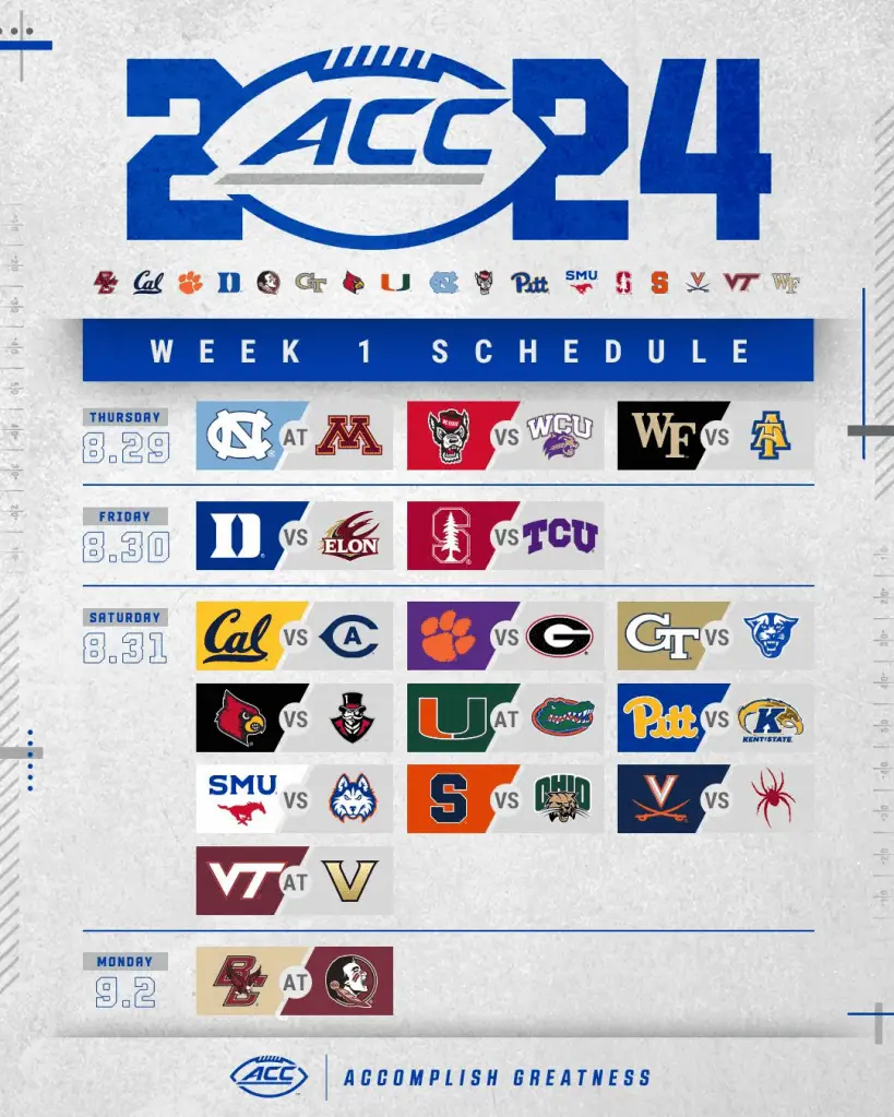 That matchup was previously announced and is part of the ACC’s Week 1 schedule that the league revealed Monday on ACC Network. The kickoff time and TV haven’t been announced.