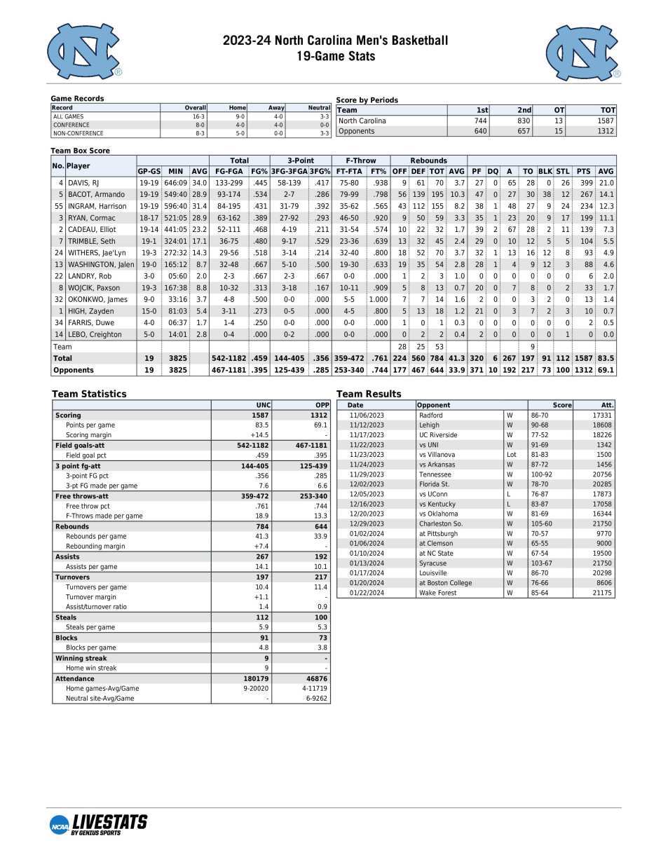 UNC season statistics