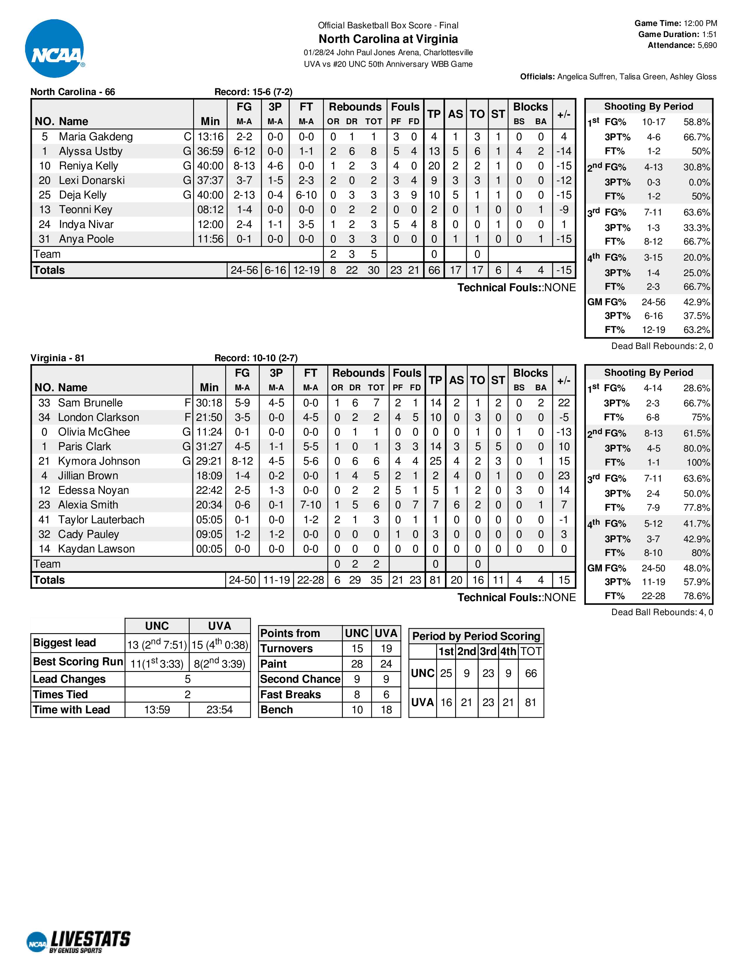 Reniya Kelly scored three 3-pointers in the first five minutes, outscoring Virginia 9–7 as UNC jumped out to a 16–7 lead. The third 3-pointer was part of an 11–0 run, which Ustby capped with a three-point play to give the Tar Heels a 12-point lead, and UNC led 25–16 after one quarter.