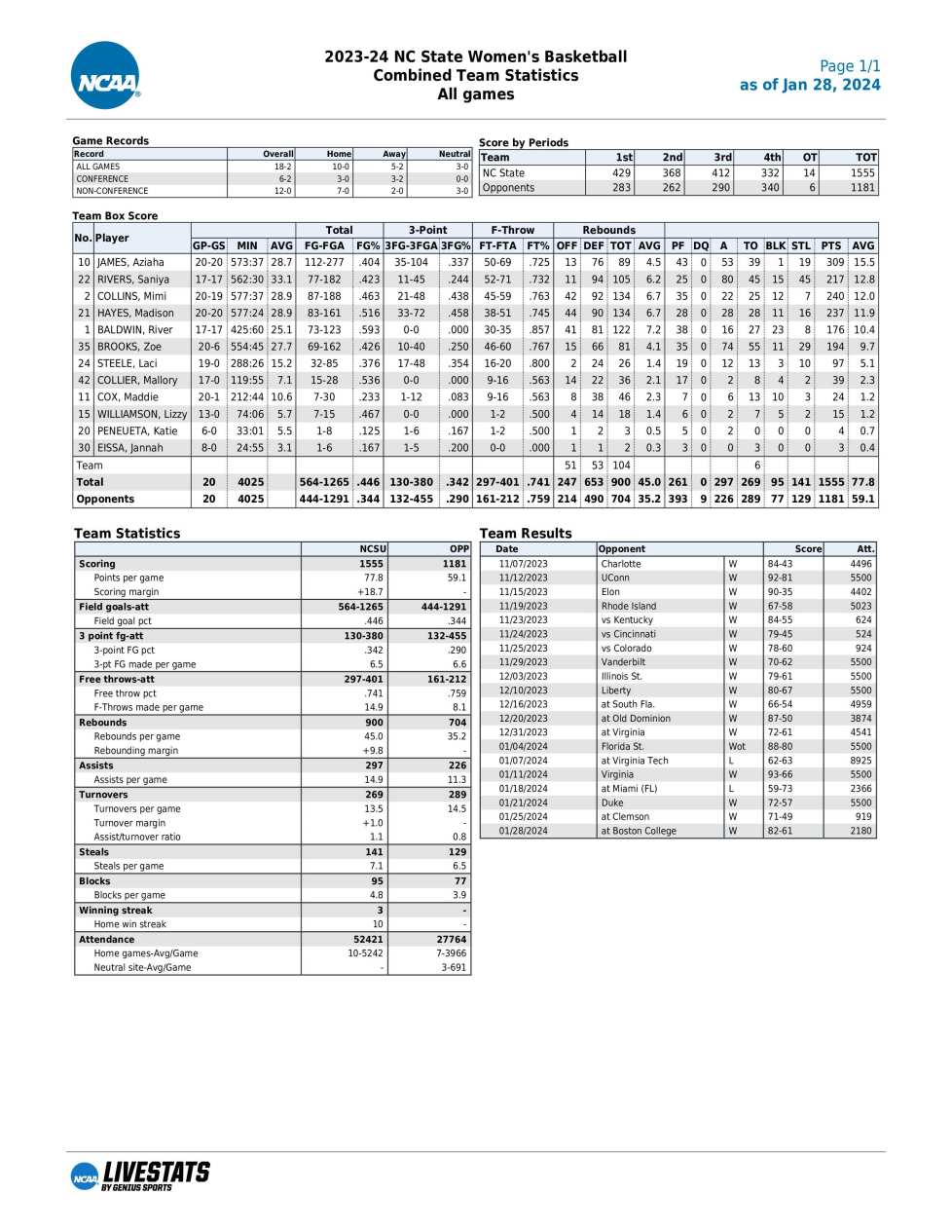 All five State starters, 5–9 junior guard Azlaha James (15.5 points, 2.7 assists), junior 6–1 guard Saniya Rivers (12.8 points, 4.7 assists), graduate 6–4 forward Mimi Collins (12.0, 6.7 rebounds), senior 6–0 guard Madison Hayes (11.9, 6.7 rebounds) and graduate 6–5 guard River Baldwin (10.4, 7.2 rebounds) average double-figure points.