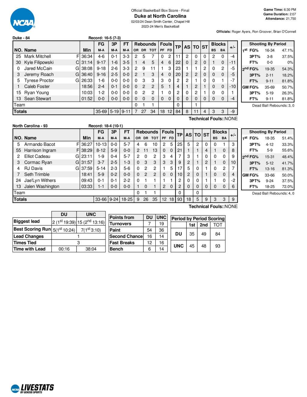 No. 3 UNC 93, No. 7 Duke 84