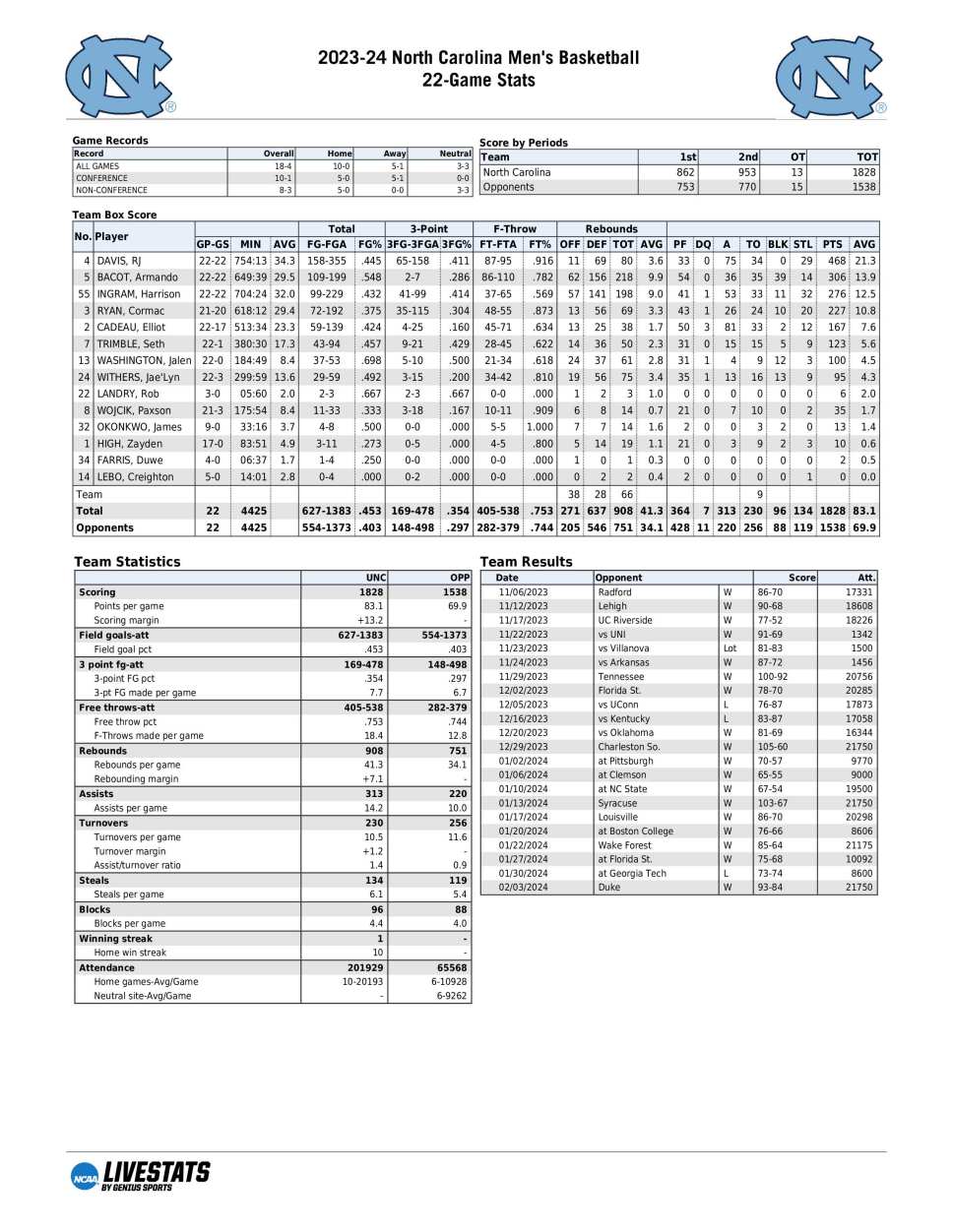 UNC season statistics