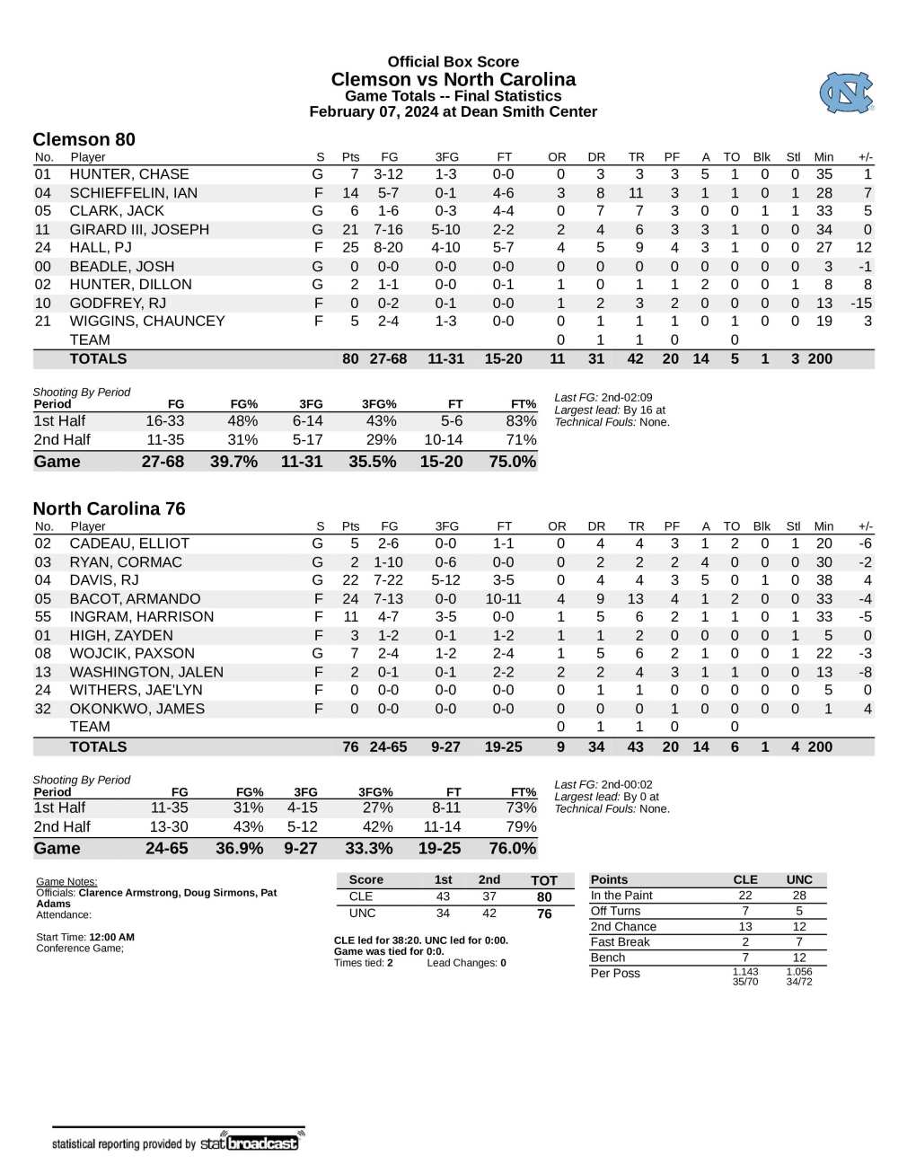 Clemson, determined for a win to help its NCAA resume and playing like the hungrier team, wouldn’t back down and never trailed in an 80–76 victory Tuesday at the Smith Center for the program’s second win in Chapel Hill.