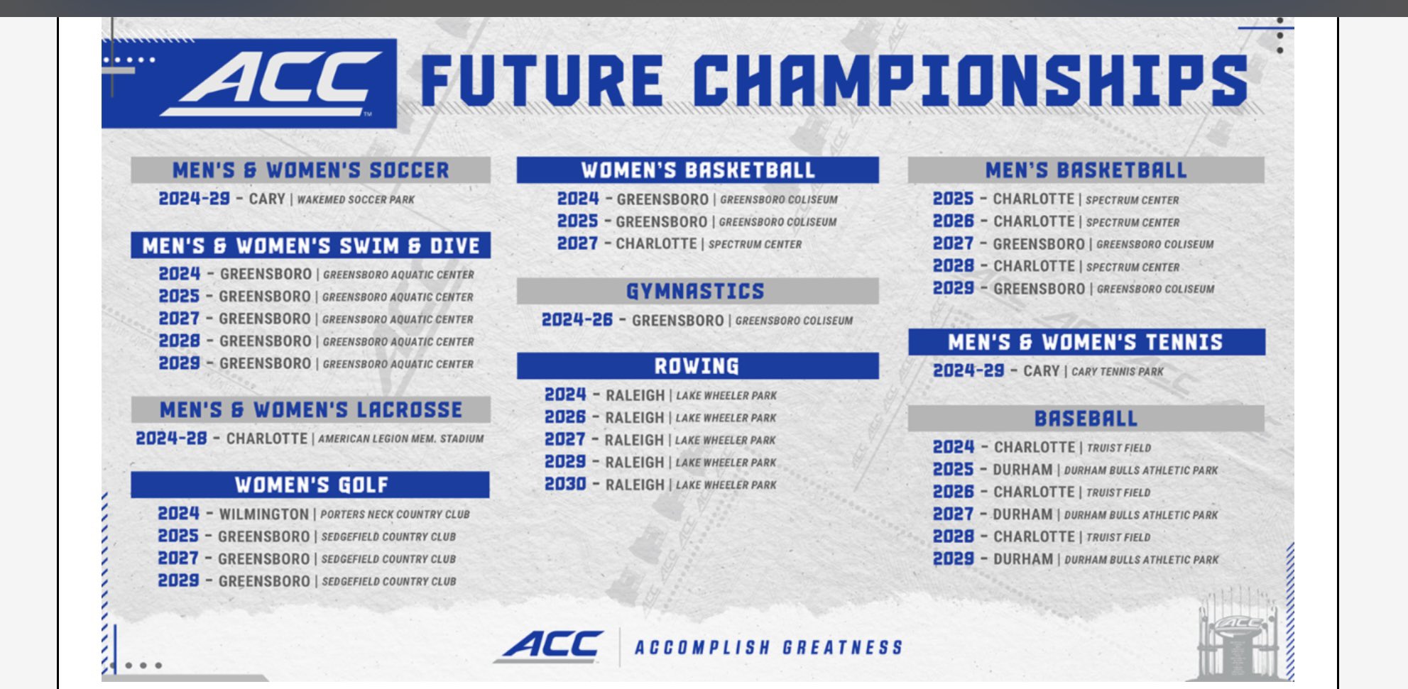 “We are also pleased to have been able to deliver so quickly on our commitment to continue to hold numerous tournaments and championships in cities across the state of North Carolina as part of the ACC Board of Directors’ decision to relocate the conference office headquarters to Charlotte,” ACC commissioner Jim Phillips said.