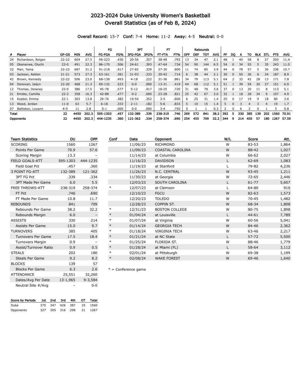 Duke comes off two easy wins against teams in the bottom of the league, beating Pittsburgh last Sunday 69–38 and Wake Forest on Thursday 69–46. The Blue Devils have had some big wins, including surprisingly easy home victories over No. 16 Virginia Tech, 63–46, and Florida State, 88–46.