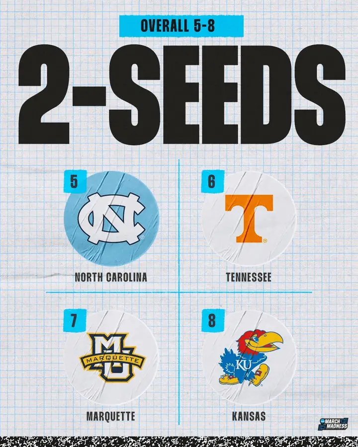 The other No. 2 seeds are No. 8 Tennessee in the Midwest, No. 4 Marquette in the South and No. 6 Kansas in the West.