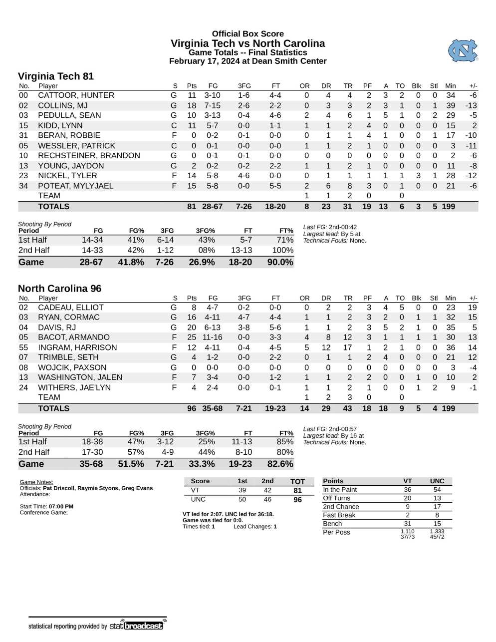 A Cadeau layup capped a 17–5 UNC run to push the lead to 14 with 7:35 left in the first half. Nickel’s third 3-pointer sparked an 8–2 Hokies run to cut the lead to five with 2:51 left. Carolina finished the half with a 6–0 run, including a Davis 3-pointer, to take a 50–39 halftime lead, its largest since a 17-point advantage against Louisville on Jan. 17.
