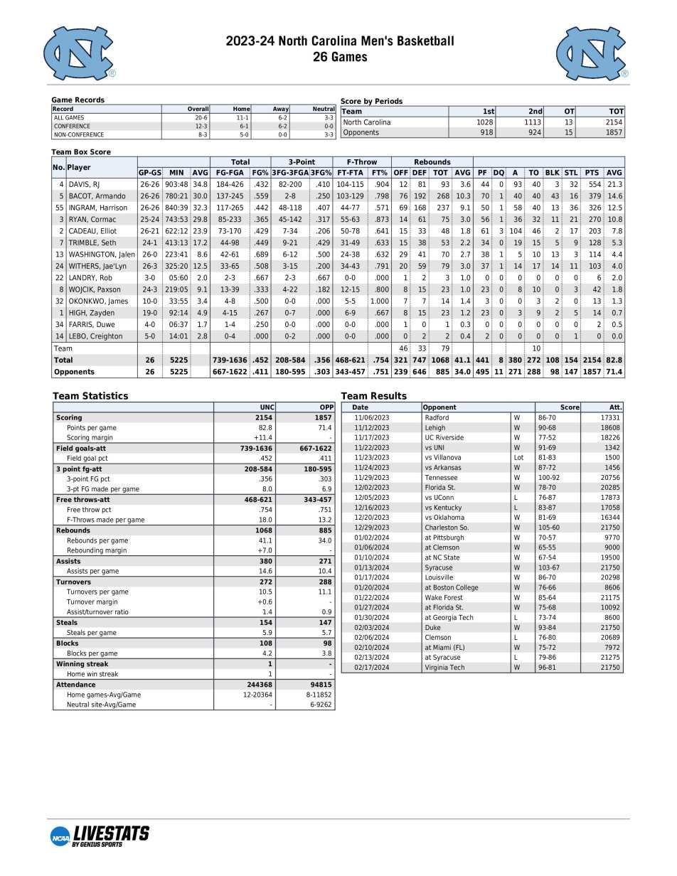 UNC (20–6, 12–3 ACC) got big games from RJ Davis (20 points, three 3-pointers), Cormac Ryan (16 points, four 3-pointers) and Ingram (12 points, 17 rebounds).