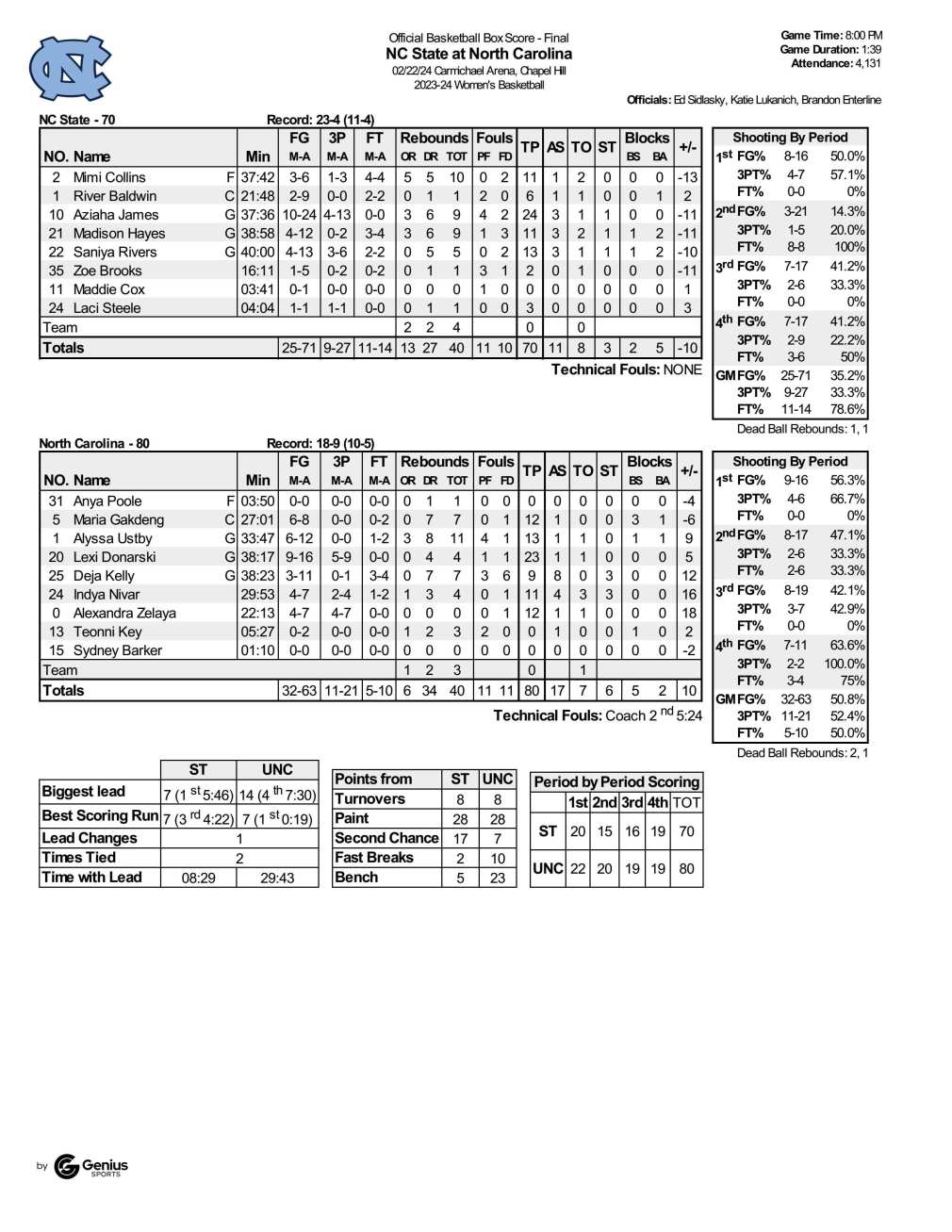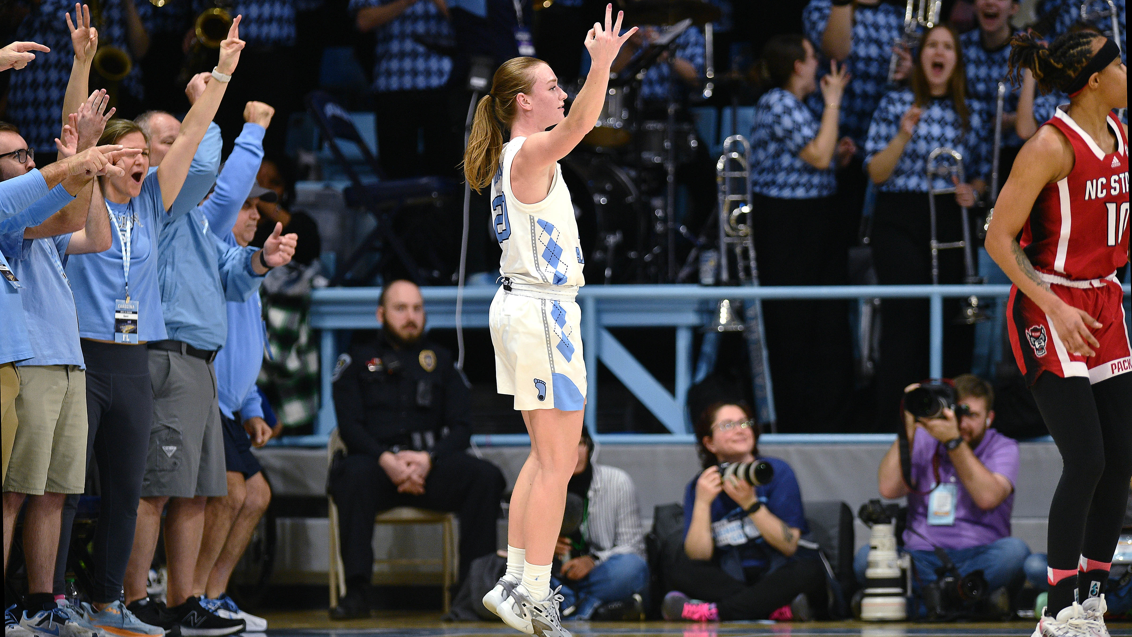 Many Tar Heels had big games, including senior Alyssa Ustby (13 points, 11 rebounds for her 15th double-double of the season and 37th of her career), senior Ali Zelaya (career-highs of 12 points and four 3-pointers), Maria Gakdeng (12 points, seven rebounds, three blocks) and sophomore Indiya Nivar (11 points, two 3-pointers, four assists and three steals).