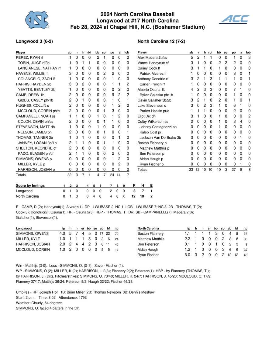 UNC chased Longwood starter Owens Simmons (0–1; 4 innings, 5 hits, 7 runs, 5 walks) after he gave up a single and three walks in the fifth inning. Catcher Luke Stevenson hit a two-run single in the four-run inning and had multiple hits for the second consecutive game.