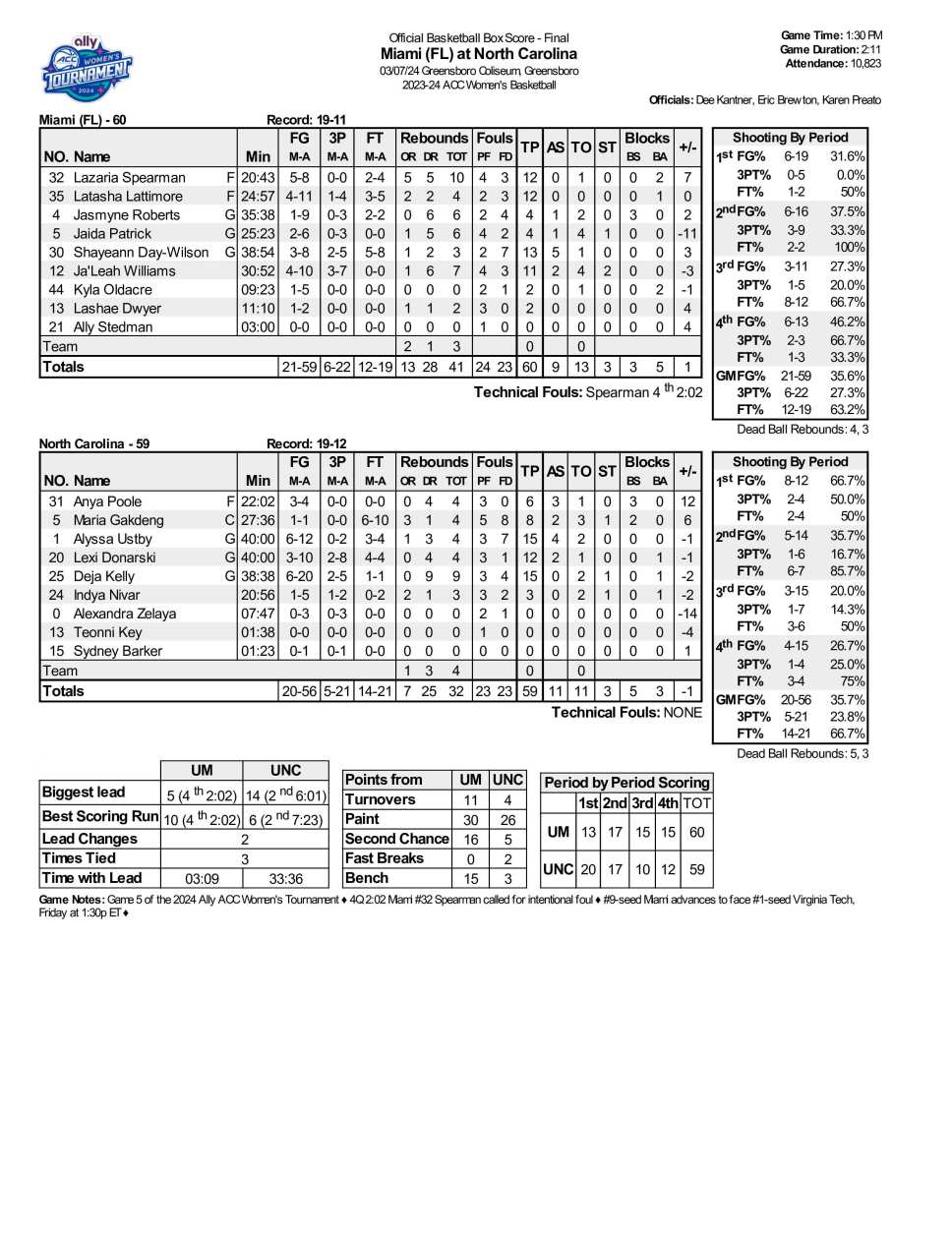 Spearman tied it on a follow shot and gave Miami a two-point lead on an inside bucket with 2:40 left during another 9–1 Miami run. Lattimore’s follow shot and three-point play with 2:04 left gave the Canes a five-point lead during a six-minute UNC field-goal drought.