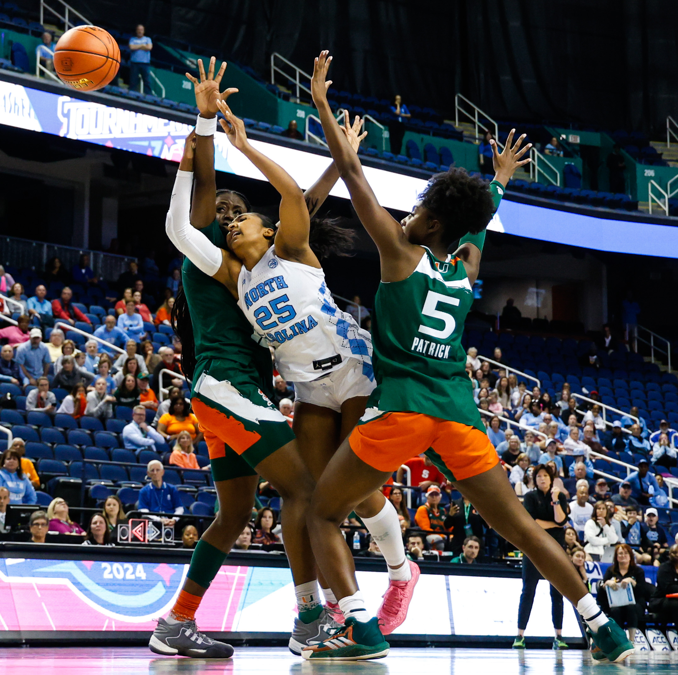 Carolina had a few chances to win it in the final hectic minutes despite going six fourth-quarter minutes without a field goal, the last when Kelly drove into a double-team from Miami’s Jaida Patrick and Ja’Leah Williams (top photo and below photo) and couldn’t get off a shot in the lane as time expired.