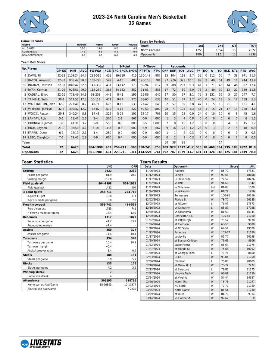 NOTES — Carolina won the only regular-season meeting with Pittsburgh 70–57 on Jan. 2 in Pittsburgh. The Panthers’ NET ranking is 45, making the semifinal meeting a Quad 1 game for the Tar Heels. … UNC is 15–2 this season when scoring 80 or more and 8-0 when scoring at least 90. … Carolina has won 10 straight ACC Tournament games when it scores 90 or more points. … The rebound margin of 26 was UNC’s second-largest in an ACC tournament game behind only the 26-rebound margin against Clemson in 1969. … Davis passed Brady Manek for second place in UNC single-season history with 99 3-pointers. Manek scored 98 in 2021–22. The record is 105 by Justin Jackson in 2017. … Davis has 1,975 career points, passing Antawn Jamison (1,974) for ninth in UNC history. … Bacot is third in ACC history with 83 double-doubles behind Tim Duncan’s 87 and Ralph Sampson’s 84. Bacot tied Syracuse’s Derrick Coleman and La Salle’s Lionel Simmons for fifth in NCAA history. … The Tar Heels shot 52.3% from the floor. UNC is 7–0 this season (22–0 under Hubert Davis, and has won 30 in a row when shooting 50% from the floor. … Hubert Davis’ 75th win ties Roy Williams for the second-most by a UNC coach in his first three seasons (Bill Guthridge had 80 from 1997 to 2000). … Withers missed a first-half dunk attempt when he was called for basket interference. It was the fourth straight game UNC has missed a dunk attempt, the previous three by Bacot. … Ryan has made a career-high 64 3-pointers this season (made 63 while playing for Notre Dame in 2022–23). … It was the eighth time this season Bacot and Ingram both had 10 or more rebounds (UNC is 7–1 in those games, all of which have come in ACC play). … Carolina won all three meetings with Florida State (earlier winning 78–70 in Chapel Hill on Dec. 2 and 75–68 at FSU on Jan. 27) and leads the all-time series 55–16, including 6–3 in the ACC tournament. … UNC is 52–15 all-time as a No. 1 seed in the ACC tournament, 49–14 in quarterfinal games, 7–0 against No. 9 seeds and 5–1 in Washington. … Cadeau was the last starter to leave the game, and that wasn’t until 3:29 remained in the game.