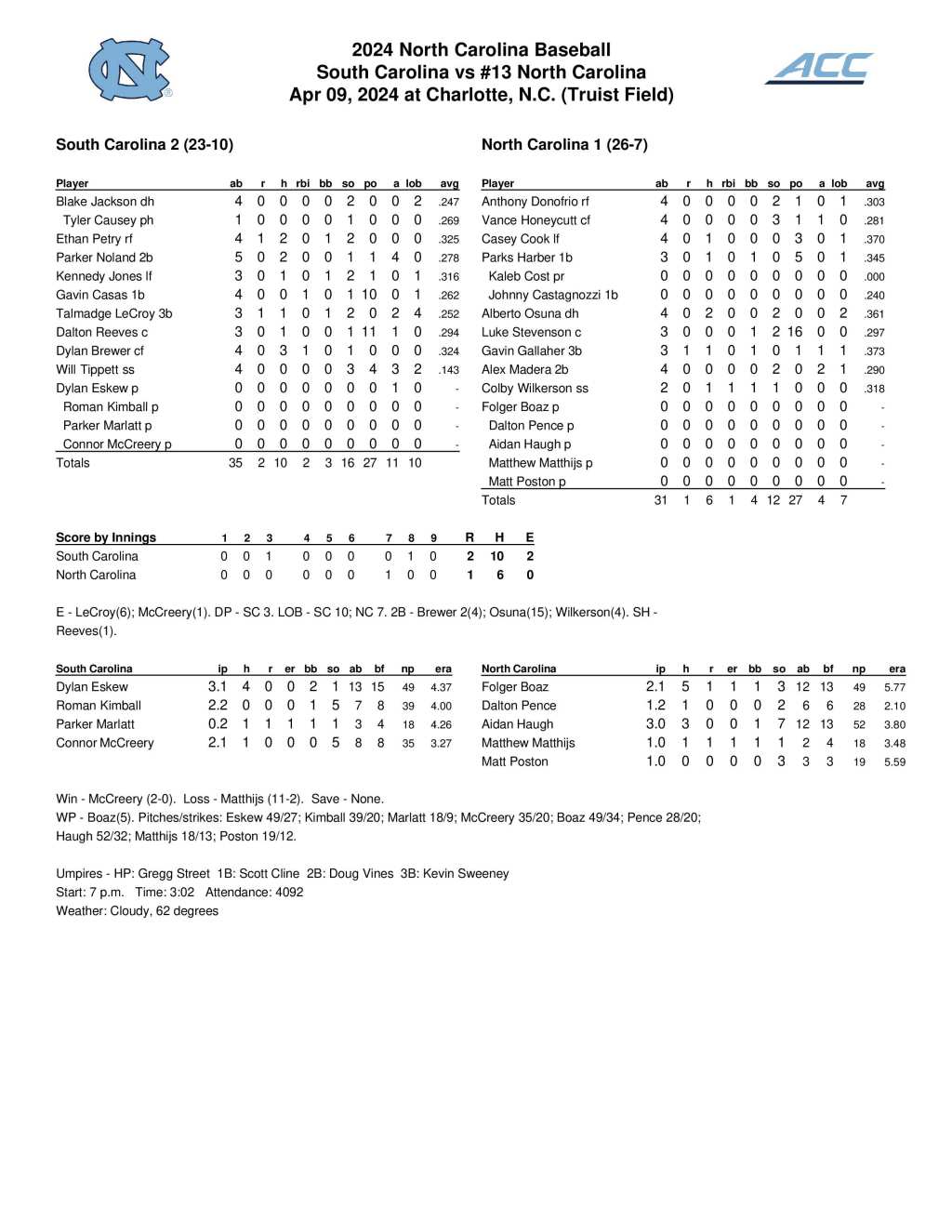 In a pitchers’ duel where big hits were scarce, South Carolina got just enough to pull out a 2–1 victory over No. 13 North Carolina at Truist Field in Charlotte on Tuesday night.