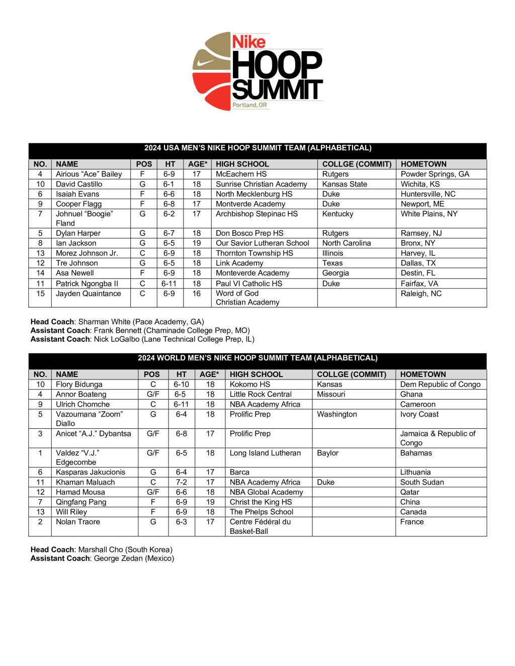 Another Duke recruit, Patrick Ngongba II, a 6–11 center from Fairfax, Va., will also play for the USA team.
