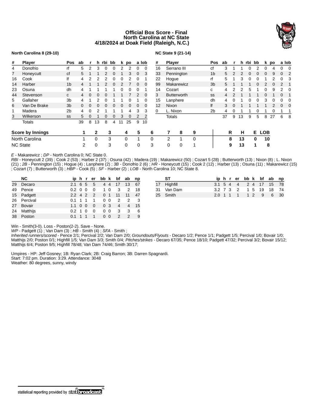 UNC (29–9, 14–5 ACC) hit five home runs to tie Virginia Tech for the ACC lead at 71, but they weren’t enough against the Wolfpack (21–14, 11–8).