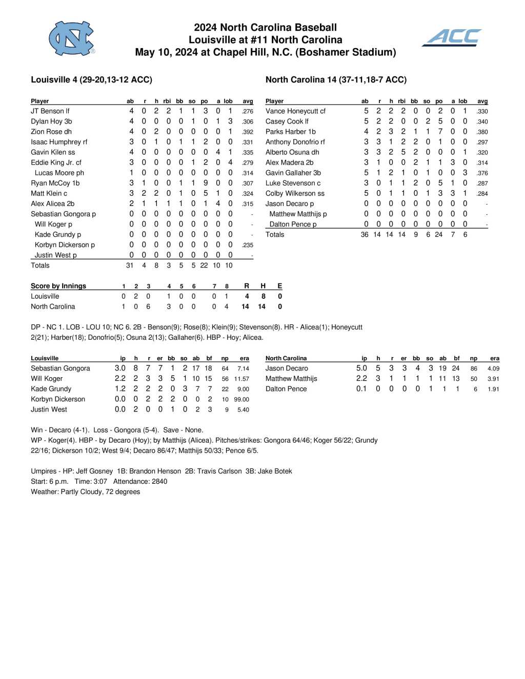 No. 11 UNC 14, Louisville 4, 7 innings (10-run rule)