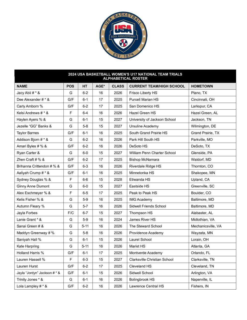 Grant, one of 10 17-year-olds trying out, is the only incoming college freshman trying out for the team. The rest of the players will graduate from high school in 2025, 2026, 2027 and 2028. Grant reclassified after earning Gatorade Virginia Girls Basketball Player of the Year honors in her junior season at James River High School in Midlothian, Va.