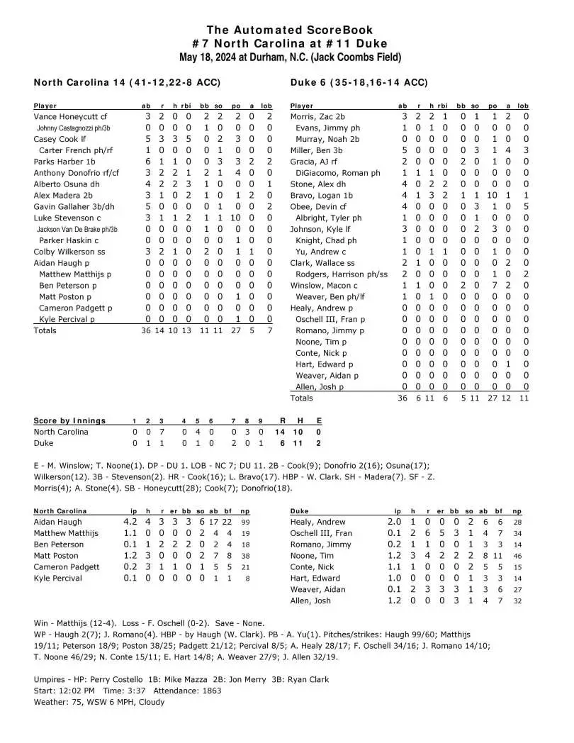 NOTES — The ACC will announce the tournament schedule on Sunday morning, but Forbes said he’s leaning toward UNC playing its round-robin games on Thursday and Friday. As the No. 1 seed, that’s UNC’s choice. … The seven-run third inning was the sixth time UNC has scored at least seven runs in an inning and the third time in ACC play. The biggest inning of the season was the 11-run first inning against Princeton on March 1, and the biggest inning in a league game was eight in the second inning against Louisville last Sunday. … Duke gave up double-digit runs for the seventh time. … It was the Tar Heels’ 12th ACC game with double-digit runs and 25th overall. … Carolina has won five consecutive series with Duke and leads the all-time series with Duke 194–108–3, including 77–45–1 in Durham. … Forbes is 8–4 against Duke. … Saturday’s game attracted 1,863 fans. … Stone has a 12-game hitting streak.