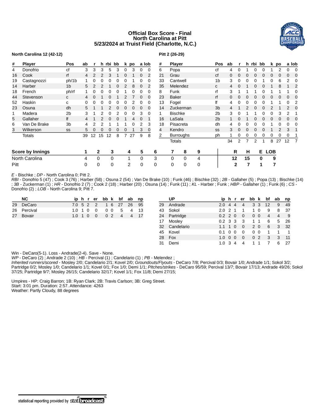 Playing as the visiting team, the first three UNC batters — and four of the first five — hit home runs. Casey Cook and Anthony Donofrio each swatted a pair of homers in the game as the top-seeded Tar Heels rolled to a 12–2 win Thursday over No. 12-seed Pittsburgh in their tournament opener, with freshman right-hander Jason DeCaro retiring 11 in a row to end a dominating performance.