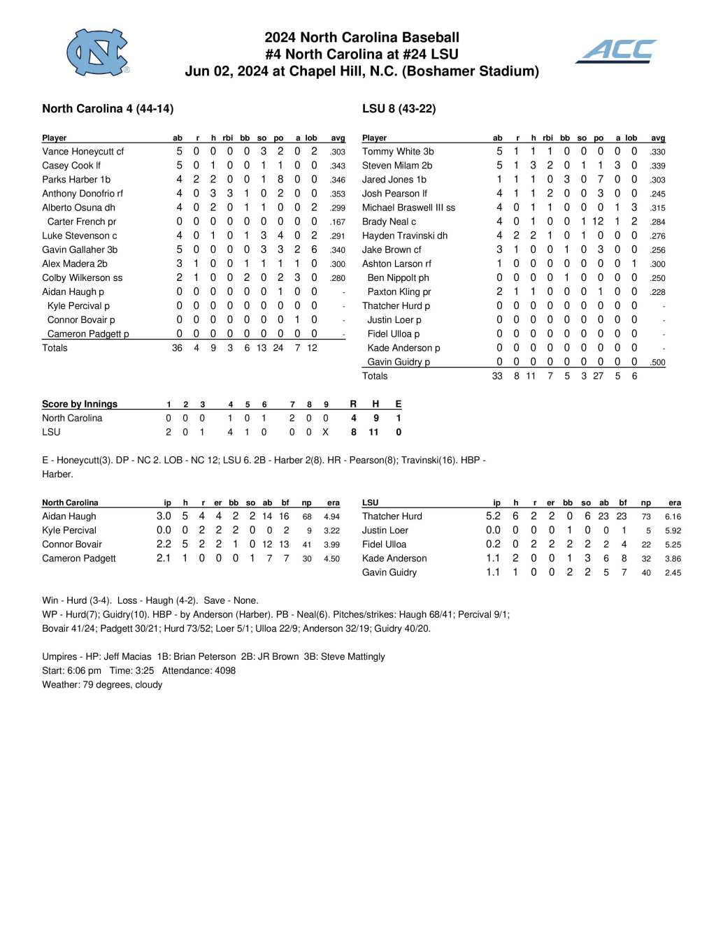 LSU (43–22) earned a spot in the Sunday night’s game by beating Wofford earlier on Sunday 13–6 in an elimination game, and kept that momentum against the Tar Heels.
