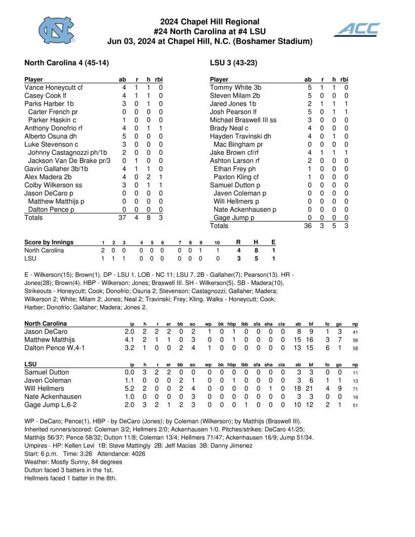 No. 6 UNC 4, No. 24 LSU 3, 10 innings