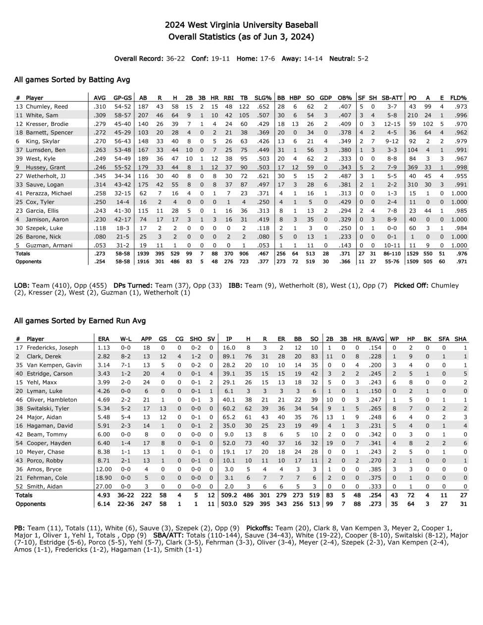 The only Mountaineer to make second-team All-Big 12 was third baseman Reed Chumley. A senior transfer from Houston Christian, he hit .310 while leading the team in home runs (15), RBI (48), total bases (122), slugging percentage (.652) and wins above replacement (3.06).