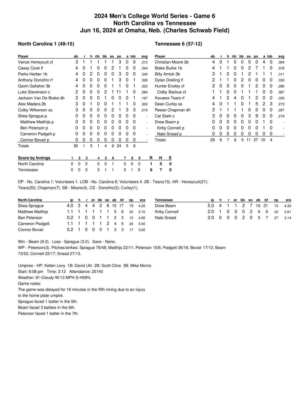 Tennessee right-hander Drew Beam (winner, 9–2) retired the first 11 Tar Heels before Harber’s bloop single to right. Anthony Donofrio became the first UNC batter to see at least four pitches but struck out swinging on a 3–2 fastball to end the fourth inning.