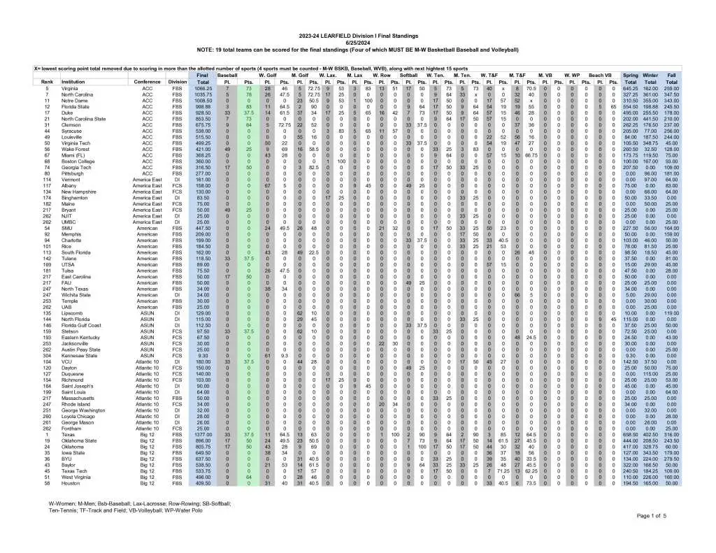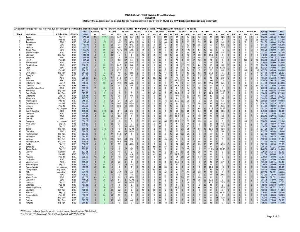 Texas won the title for the third time in four years with 1,377 points. The Longhorns, future ACC school Stanford and UNC are the only schools to win the Directors’ Cup in its 30 years of competition.