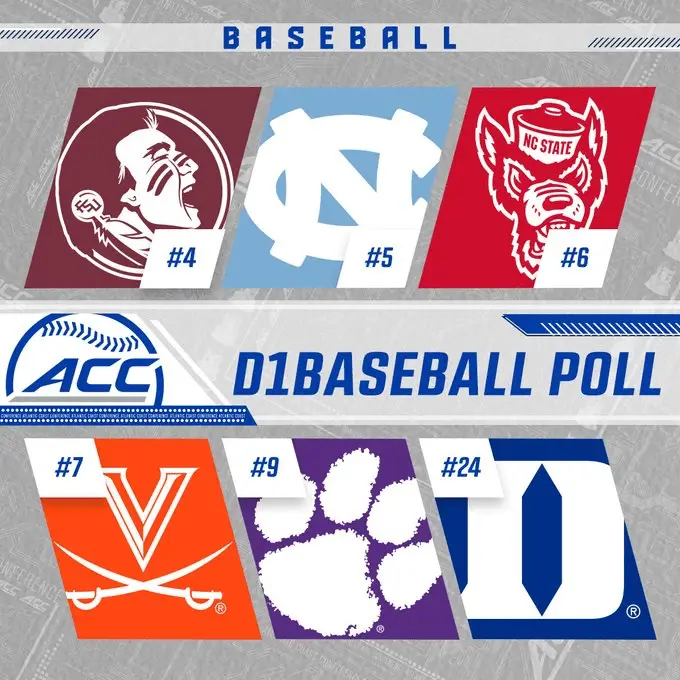 Carolina is one of five ACC teams in the top 10 in the D1 Baseball poll, with Florida State No. 4 (49–17; up five spots), N.C. State No. 6 (39–23; up five spots), Virginia No. 7 (46–17; up 11 spots) and Clemson No. 9 (44–16; down six spots). Also in the final poll is Duke at No. 24 (40–20; down 12 spots), while Wake Forest (38–22), No. 19 in the previous poll, dropped out.