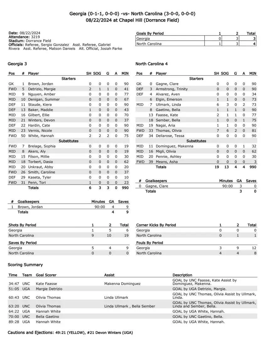In Damon Nahas’ first home game as interim coach, the No. 5 Tar Heels earned an entertaining 4–3 victory over No. 16 Georgia on Thursday behind two dazzling Olivia Thomas second-half goals. UNC (3–0–0) remained unbeaten in home openers since the renovated facility was named after legendary retired coach Anson Dorrance.