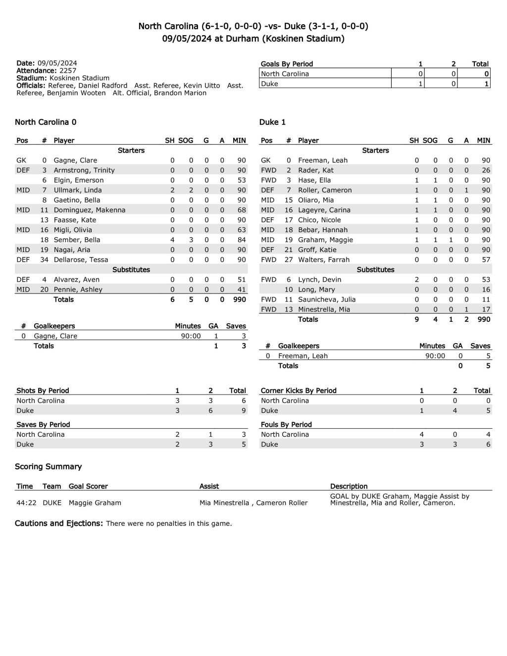Duke’s nine shots were a season-high for a Carolina opponent. The veteran Blue Devils (3–1–0) had four shots in the first 10 minutes after halftime. UNC tried to get the right pass combinations to create good chances, but the Blue Devils were often present for interceptions.