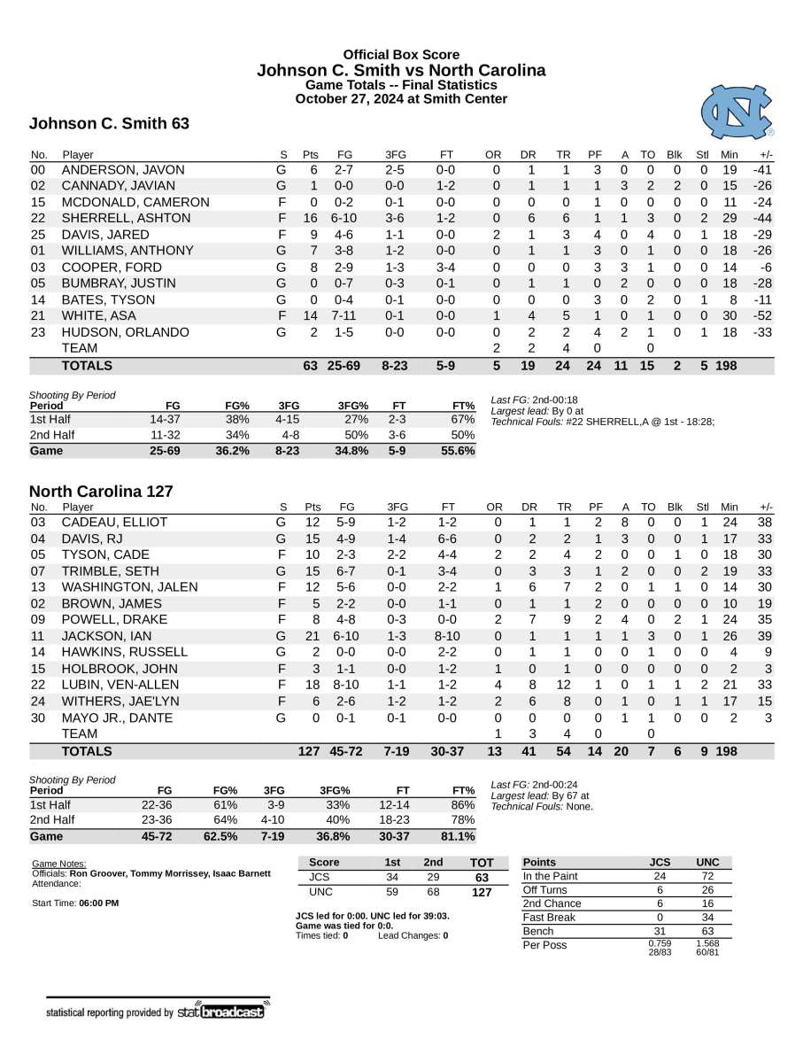 Johnson C. Smith scored four 3-pointers and made some tough shots to stay within two, 25–23, in the first 11 minutes. UNC turned up the defensive intensity, though, with an RJ Davis steal turned into a Trimble layup off a lob pass, igniting a 28–6 run to seize a 24-point lead, 53–29, after transition layups from Trimble and freshman Powell.